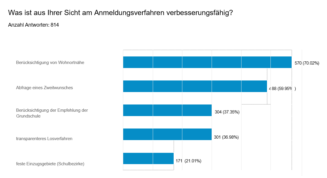 • Die Eltern wünschen sich eine Veränderung des Vergabeverfahrens. Die Mehrheit sieht, genau wie bei Grundschulen, die Wohnortnähe als wichtigstes Kriterium an. Zudem wünschen sich die Eltern die Möglichkeit eines Zweitwunsches, wie im Anmeldeverfahren an Grundschulen üblich. Die Absage an der Wunschschule scheint für viel Familien nicht das Hauptproblem zu sein. Das Wissen, im weiteren Verfahren kaum noch Möglichkeiten einer Anmeldung im Wohnumfeld zu haben, und unter Umständen an sehr weit entfernte Schulen der gewünschten Schulform verwiesen zu werden, erzeugt großen Stress, Unzufriedenheit und Unsicherheit.
